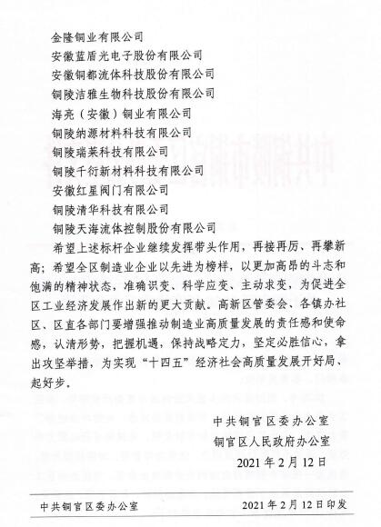 2021年2月20日,公司榮獲2020年度銅官區(qū)優(yōu)秀工業(yè)企業(yè),后續(xù)公司將繼續(xù)追求卓越,承擔(dān)企業(yè)社會責(zé)任工作,為地方經(jīng)濟(jì)發(fā)展助力。