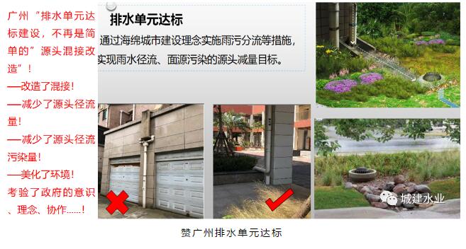 道路排水管道要為將服務(wù)范圍內(nèi)排水對(duì)象的污水、雨水有效接入創(chuàng)造條件。自2006年,上海市水務(wù)局在推進(jìn)第三輪環(huán)保三年行動(dòng)計(jì)劃時(shí),就提出了二級(jí)管網(wǎng)(沿道路敷設(shè),服務(wù)于道路兩側(cè)排水戶的排水管道)包括伸出道路紅線一米的支管和支管末端檢查井,以便于三級(jí)管網(wǎng)(街坊、小區(qū)、企事業(yè)單位內(nèi))排水管道的接入?,F(xiàn)在看來,無疑是對(duì)實(shí)現(xiàn)污水全收集是正確和合理的。另外為了應(yīng)對(duì)雨水排水標(biāo)準(zhǔn)提高,有兩個(gè)做法,一是做“加法”,二是做“減法”?!凹臃ā辈粏问前凑招碌臉?biāo)準(zhǔn)加大道路雨水管管徑,更重要的是要按照新的雨水標(biāo)準(zhǔn)把雨水篦子和連管設(shè)置好,要讓雨水系統(tǒng)能夠做到(雨水口)“嘴巴喝得進(jìn)”、(連管)“嗓子進(jìn)得去”、(道路雨水管)“腸子不梗阻”、(雨水排口)“排口排得出”。一定要記住脫離雨水收集口的雨水排水設(shè)計(jì)是不完整的雨水排水設(shè)計(jì)?!皽p法”就是做好LID,利用“海綿措施”把徑流量減下來,“減法”實(shí)際上也是對(duì)“進(jìn)口”一種創(chuàng)新設(shè)計(jì)。將道路綠化隔離帶、人行道、小區(qū)內(nèi)部、屋頂進(jìn)行海綿化改造和設(shè)計(jì),這就是創(chuàng)建“海綿城市”的具體行動(dòng),這就是城市工程海綿化。圖中美國(guó)費(fèi)城的“綠色英畝計(jì)劃”案例就證明,“減法”是雨水排水提標(biāo)的重要手段。做好“減法”還會(huì)收到一個(gè)非常好的效果,那就是有效減少了“徑流污染”,這是實(shí)現(xiàn)城市水體“下雨不黑”的最有效措施?!皽p法”體現(xiàn)的是“綠、灰”相結(jié)合,體現(xiàn)的是“優(yōu)先考慮更多利用自然力量排水”。廣州利用綠色措施實(shí)現(xiàn)“排水單元達(dá)標(biāo)”就是對(duì)雨污混接改造工作的創(chuàng)造性發(fā)展。很多城市雨水排水規(guī)劃、設(shè)計(jì)文件為體現(xiàn)海綿城市創(chuàng)建和提標(biāo),不談綠色措施,而簡(jiǎn)單地將“綜合徑流系數(shù)”調(diào)整0.6是不科學(xué)、不現(xiàn)實(shí)和不負(fù)責(zé)任的做法。
